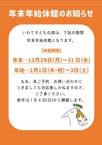 いつもいわて子どもの森をご利用いただきありがとうございます。年末・年始休館日は以下の通りです。■年末休館日:12月29日(月)〜 12月31日(水)■年始休館日:1月1日(木・祝)〜 1月3日(土)なお、年末年始休館中は、宿泊予約などお電話での問い合わせも対応致しかねますので、ご了承ください。新年は1月4日(日)から開館します。皆さまのご来館を心よりお待ちしております。