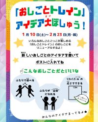 いろんなおしごとごっこが楽しめる「おしごとトレイン」のおしごとをリニューアルするよ!今年も、みんなから新しいおしごとのアイデアを大募集します。「こんなおしごとをやってみたい!」「こんなお店屋さんがあったらいいな!」など、みんなのアイデアを教えてね。たくさんの応募待ってるよ!■募集期間1月10日(土)〜2月23日(月・祝)■応募方法館内に設置している特設コーナーで描いて回収ポストに入れる。■設置場所@グリーンホールAなんでも広場前