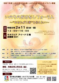 本フォーラムは、今年度いのちのおはなしキャラバン事業を実施した団体の事例紹介や参加者同士の交流等を通じて、いのちの大切さを伝えていくことの意義や、そのために私たち子育て支援者ができることについて学び合うことを目的とし開催します。