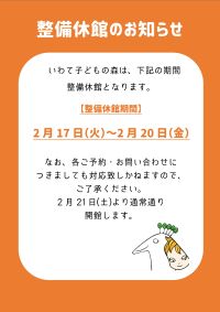 いつもいわて子どもの森をご利用いただきありがとうございます。2月の整備休館についてお知らせします。〇2月17日(火)〜2月20日(金)なお、各ご予約、お問い合わせにつきましては、休館日前日の午後5時までにお願いいたします。2月21日(土)から通常通り開館いたします。皆さまのお越しをお待ちしております。