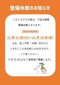 いつもいわて子どもの森をご利用いただきありがとうございます。11月の整備休館についてお知らせします。〇11月11日(火)〜11月14日(金)なお、各ご予約、お問い合わせにつきましては、休館日前日の午後5時までにお願いいたします。11月15日(土)から通常通り開館いたします。皆さまのお越しをお待ちしております。